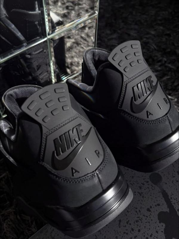 The 2025 edition of the Air Jordan 4 Retro 'Black Cat' brings back an original 2006 release. A solid black finish is executed on the smooth nubuck upper, featuring OG details like quarter panel netting, molded eyelets, and support wings. Tonal Jumpman branding decorates the woven tongue tag and heel tab. A matching black polyurethane midsole packs a visible Air-sole unit in the heel.