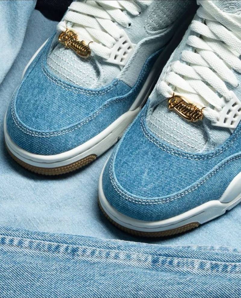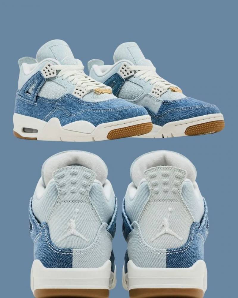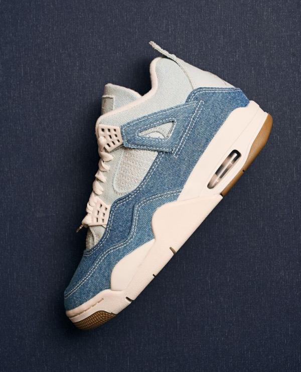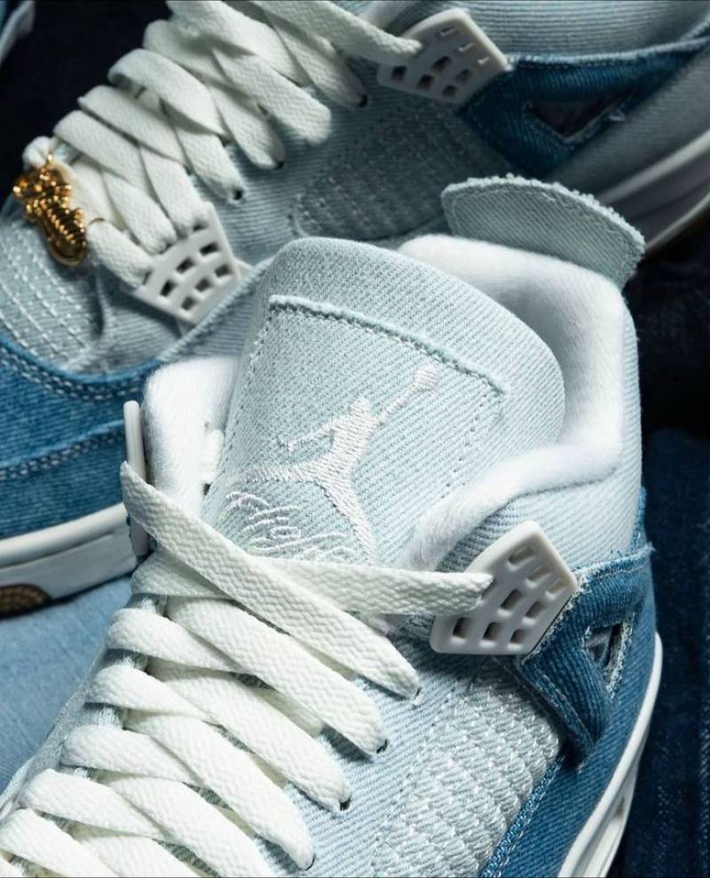 The Air Jordan 4 Retro TEX 'Worn Blue Denim' is crafted from cotton denim in two different washes. Quarter panel netting is replaced with contrast stitch detailing. In addition to Jumpman branding on the tongue and heel tab, branding elements include a 'Family' lace dubrae in metallic gold. Lightweight cushioning arrives via a white polyurethane midsole, fitted with an Air-sole heel unit and supported by a gum rubber outsole